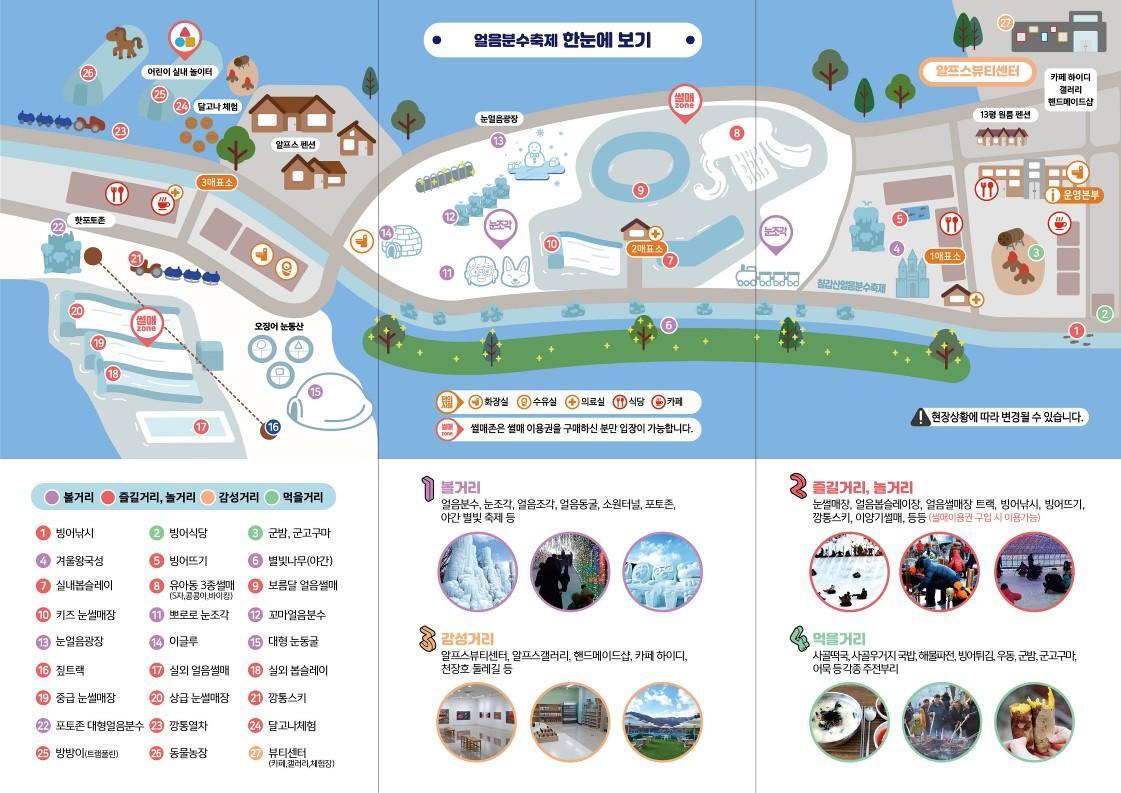 대형 눈조각 전시, 개막행사, 눈꽃 등반대회 및 눈 미끄럼틀 등 각종 체험행사가 준비되어 있어요.
